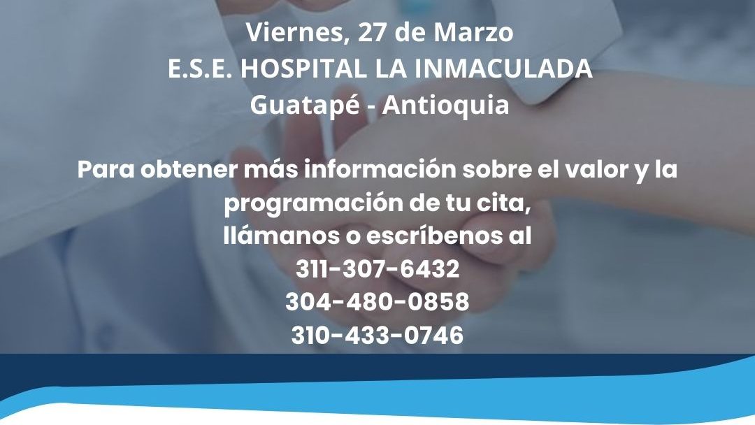 La jornada se realizará el viernes 27 de marzo en el Hospital Inmaculada de Guatapé. Las personas interesadas pueden comunicarse a las líneas telefónicas habilitadas para recibir más información y agendar su cita.