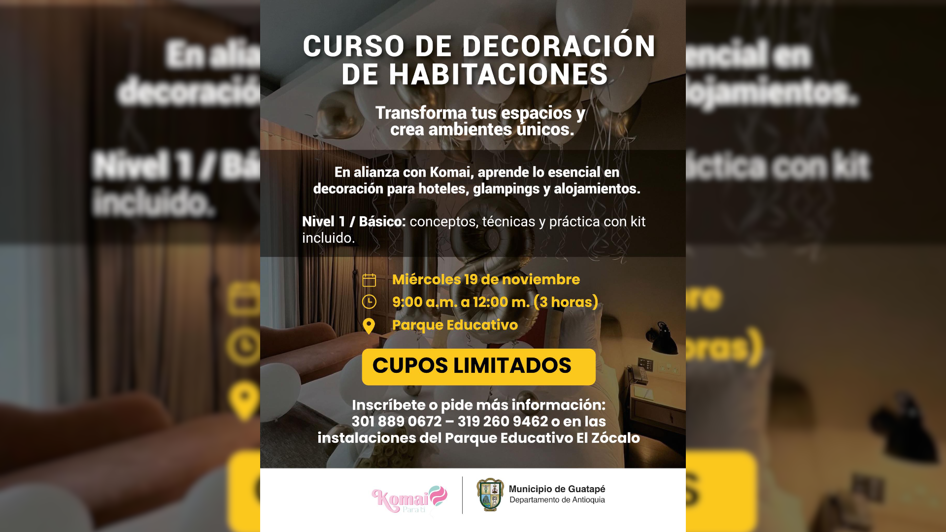 El próximo 19 de noviembre, el Parque Educativo El Zócalo de Guatapé será el escenario de un curso básico de decoración de habitaciones, una iniciativa conjunta entre la Administración Municipal, Komai y el Parque Educativo El Zócalo. Esta capacitación busca impulsar la creatividad y fortalecer la oferta turística del municipio, invitando a la comunidad a transformar los espacios de alojamiento con estilo y funcionalidad.