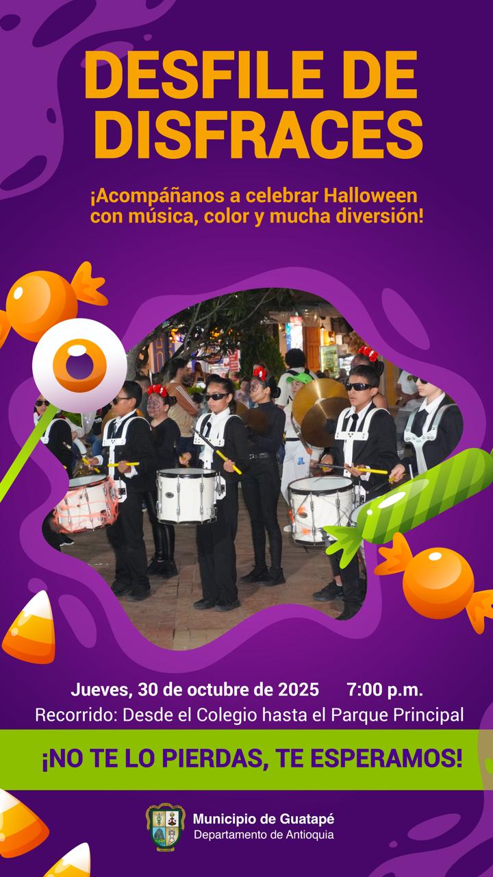 Guatapé se alista para vivir una jornada llena de color, alegría y música. El Centro de Formación Artística, a través de su Área de Música y la Banda Marcial, invita a toda la comunidad a participar en un gran desfile de disfraces y show especial de Halloween, una actividad pensada especialmente para los niños y niñas del municipio.