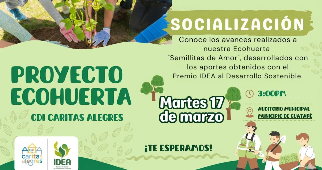 El Centro de Desarrollo Infantil C.D.I. Caritas Alegres continúa fortaleciendo los procesos educativos enfocados en el cuidado del medio ambiente y la seguridad alimentaria. Este próximo 17 de marzo a las 3:00 p. m., en el Auditorio Municipal de Guatapé, se realizará la socialización de los avances del proyecto Eco Huerta “Semillitas de Amor”, una iniciativa que ha permitido mejorar los espacios pedagógicos y promover hábitos saludables en los niños y niñas.