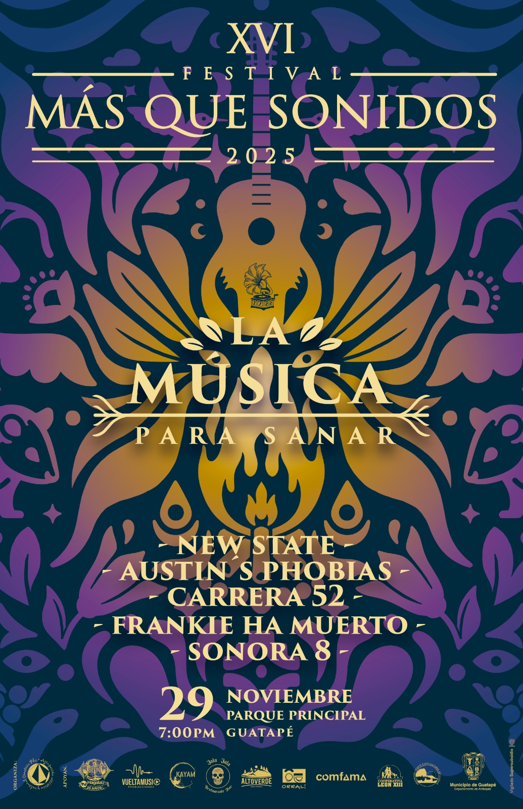 Te esperamos el 29 de noviembre desde las 7:00 p. m. en el Parque Principal de Guatapé para celebrar la decimosexta edición del Festival Más Que Sonidos —La Música para Sanar—.