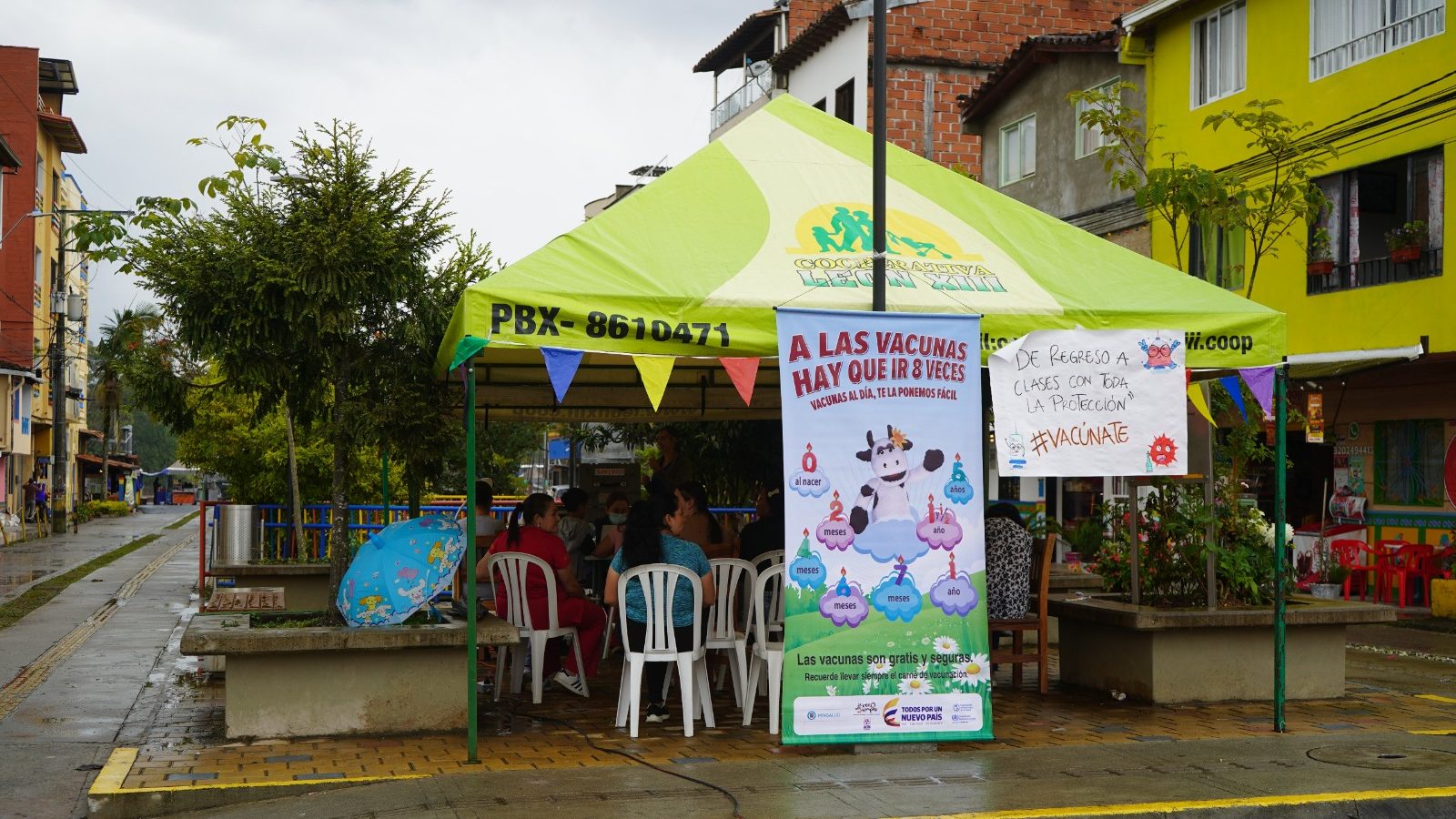 Además de los puntos fijos en el parque infantil, el equipo de vacunación adelanta microplaneación para llegar a las veredas y centros educativos del municipio con jornadas extramurales y vacunación casa a casa.