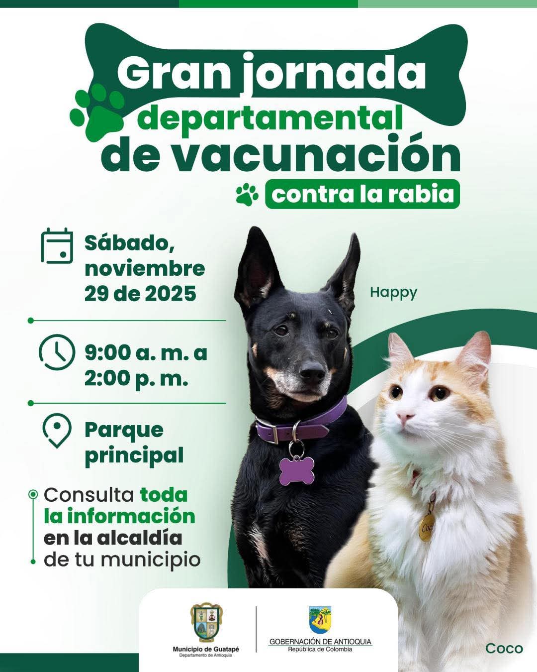 Este sábado 29 de noviembre, Guatapé vivirá una nueva jornada de vacunación contra la rabia dirigida a perros y gatos, una iniciativa liderada por la Gobernación de Antioquia y apoyada por la Administración Municipal. El objetivo es claro: proteger la salud de las mascotas y prevenir riesgos para toda la comunidad. Como lo recuerda la técnica en salud Sonia García, “la rabia es una enfermedad mortal que puede transmitirse de animales a humanos, por eso la importancia de vacunar perros y gatos a partir de los tres meses”.