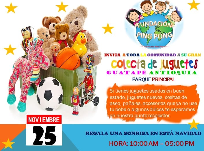 Este próximo 25 de noviembre se estará realizando una jornada de recolección de juguetes por parte de la fundación ping pong que serán entregados a las familias de escasos recursos económicos que tengan niños pequeños; se estarán recibiendo además de juguetes, ropa en buen estado, utensilios de aseo, accesorios de bebe, pañales, entre otros. Se espera que la jornada se realice en el parque principal ya que se encuentran a la espera de la confirmación de los permisos por parte de la administración municipal.