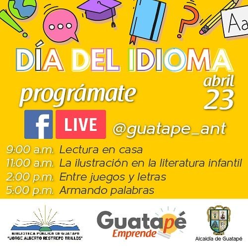 Durante todo el día se tendrán actividades lideradas desde la biblioteca pública municipal Jorge Alberto restrepo trillos del municipio de Guatapé con lo que se unen a la celebración del día del idioma este 23 de abril; para este año, y a raíz de la cuarentena a nivel nacional, las TICs toman un papel importante, llegando así a mas lugares y personas con actividades como: